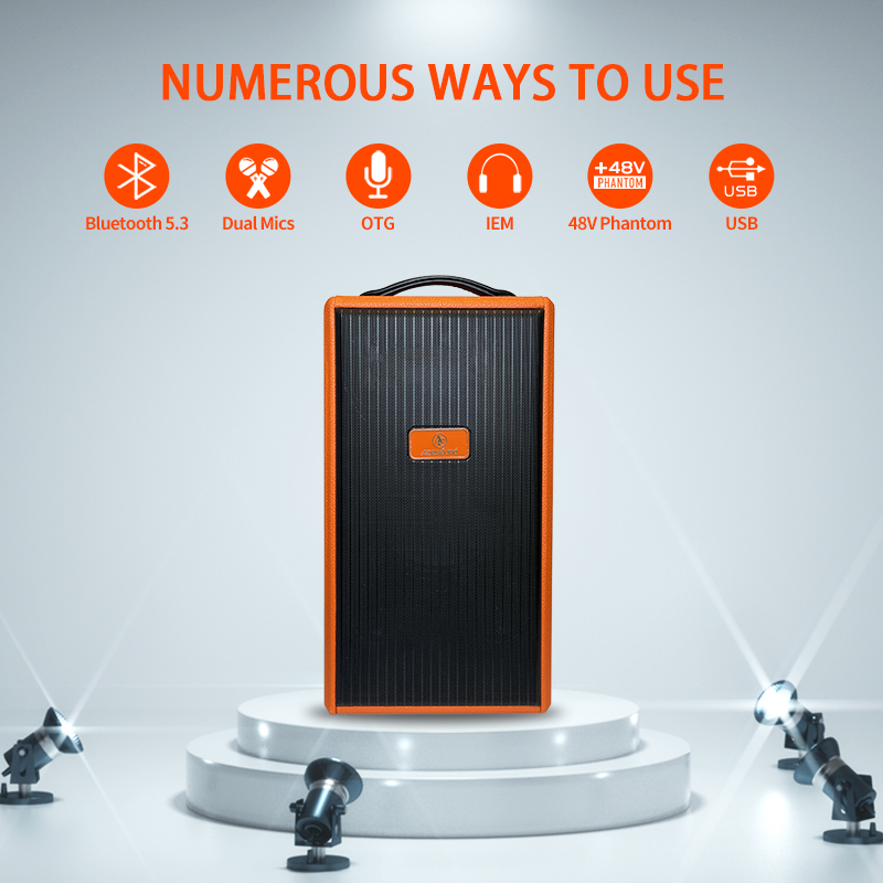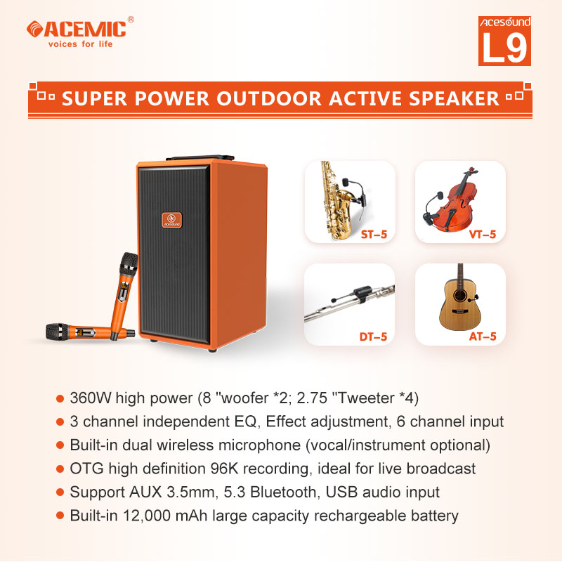 About this item【Bluetooth Speaker with Subwoofer】The portable instrument speaker is big powerful portable stereo bass speaker, it have 6 loudspeakers including 2pcs 8" woofers, 4pcs 2.75" tweeters and a rear heavy bass guide tube. Output Power 360W surround sound and amazing bass sound. This music speaker is very suitable for outdoor and indoor home party.【Advanced Bluetooth 5.3 and Wooden Speaker】The instrument speaker is built_in Bluetooth 5.3 Chip , working distance up to 120ft range, easily connectable all Bluetooth-enabled device, such as your iPhone, iPad, smartphone, cellphone, tablet, MacBook, laptop, and all other Bluetooth devices. This music speaker is designed with a wooden structure to give you better bass and clearer sound.【Multifunctional Speaker】The portable instrument speaker supports AUX 3.5mm input, U-disk music playback, TF Card music playback, 5.3 Bluetooth and OTG high definition 96K recording. It's built-in 12000mAh rechargeable battery, providing up to 6~15 hours play time ( depends on playing volume). You can enjoy the carnival whether it is an indoor or outdoor dance party. This music speaker is great for camping trips, barbecues and even singing karaoke, weddings, conferences etc.【Karaoke Machine and UHF Wireless Mic】This instrument speaker comes with UHF dual handheld wireless microphone, operating range up to 164ft (50m), great for your party karaoke, The music speaker and the wireless mic will connect automatically when they turned on. 6 extra microphone jacks allow you to connect more microphones and karaoke with your family and friends. you can also remotely control the speaker functions. Ideal as a holiday gift for Birthday, Christmas, for your kids or friends.【First Choice for Band Outdoor Performance】The portable instrument speaker comes with selectable dual wireless instrument microphones for Saxophone, Violin, Accordion, Acoustic Guitar, Flute, Harmonica, Clarinet etc, good choice for singer, musician, whole band, guitarist, violinist outdoor instrument playing.360W Big Powerful Music Speaker Portable - Your Final Choice.The instrument speaker that everyone has been looking for is here---L9 is designed with a wooden structure to give you better bass and clearer sound. Not just loud, but really powerful, whether you are at home or on outdoor, it will bring you unprecedented listening.