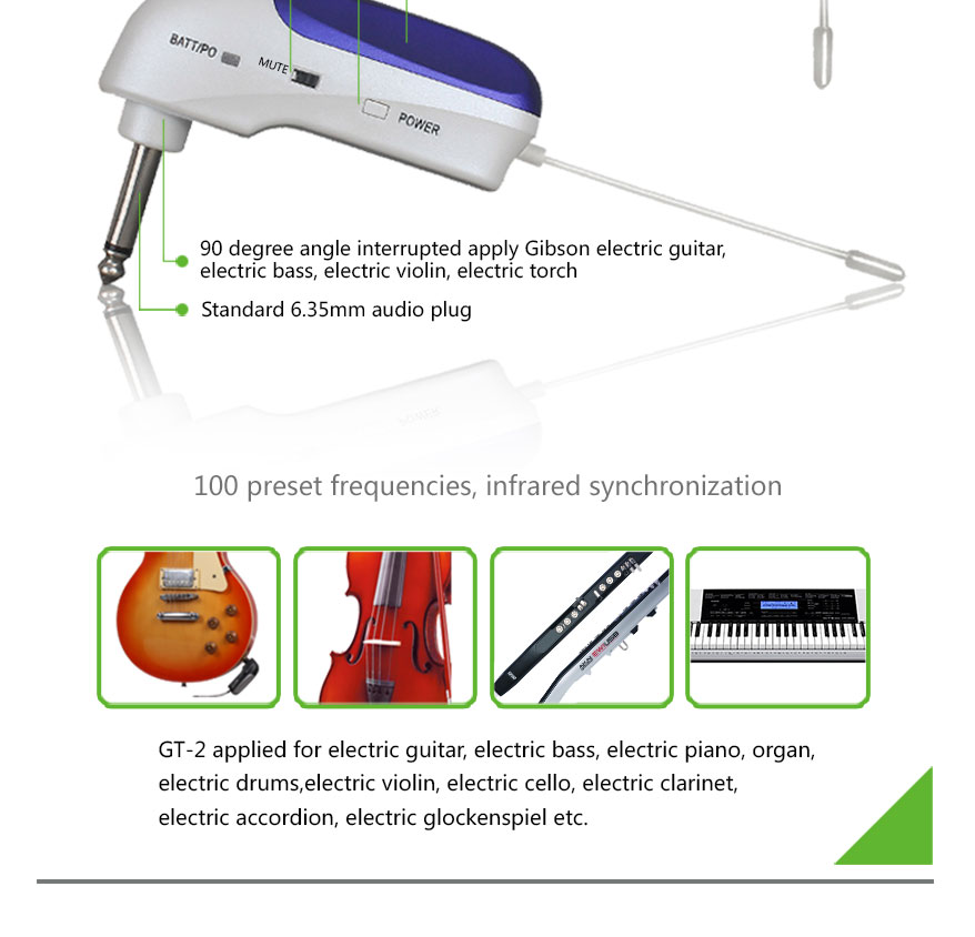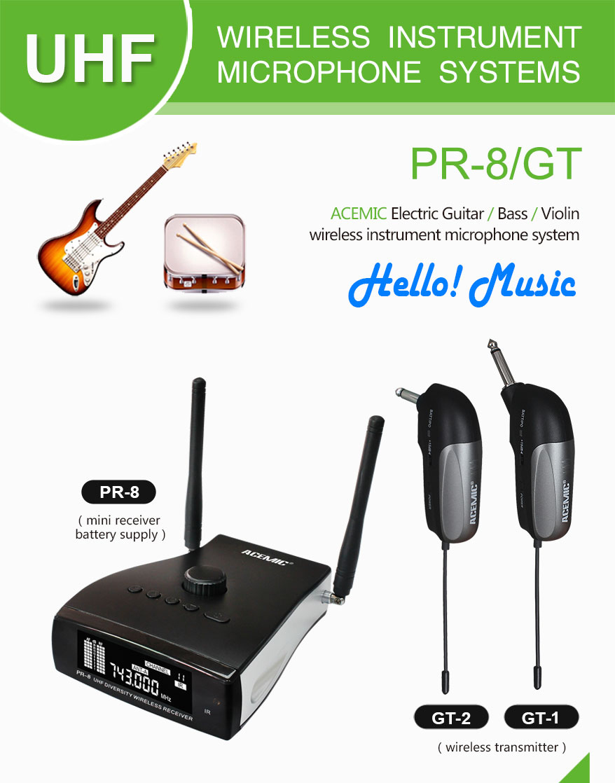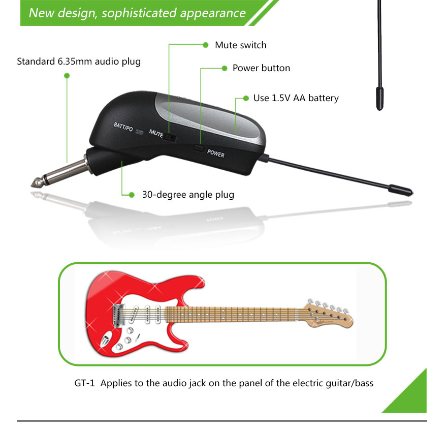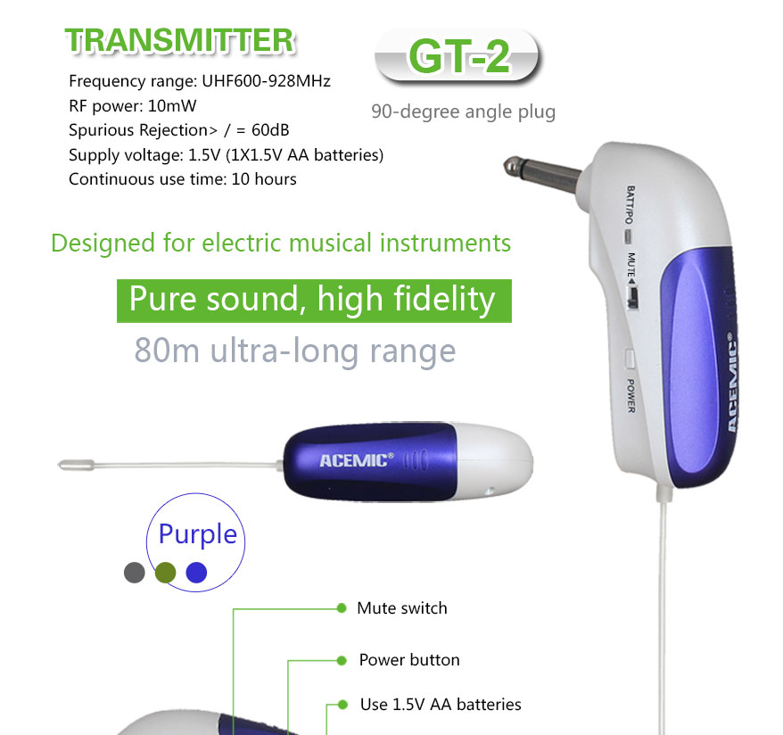 About this item:• Ideal for the gigging guitar or bass player, the PR-8/GT wireless guitar system offers quality sound, dependable performance, and simple setup. It features a compact GT plug-in guitar transmitter with a two selectable connectors GT-1(30°Angle) and GT-2(90°Angle) that plugs into a variety of instrument jacks, including acoustic/electric and bass guitars, electric violins, and even accordions.• Designed to be an extension of your instrument, the wireless guitar system delivers a true wireless experience with no bodypack and no cable, allowing you to move freely around the stage during rehearsals or performances—interacting with other musicians and the audience.• The PR-8/GT wireless guitar system includes a PR-8 receiver, which can be placed on top of your amp or securely rackmounted in a portable flight case using the necessary hardware. Two output connectors allow you to connect the receiver to an amplifier, sound system, or recording board.• The wireless transmitter provides up to 10 hours of continuous use on a single AA battery. The 262ft (80m) operating range offers ample coverage for small to mid-size venues. For gigs where several musicians use wireless, up to 8 systems can operate simultaneously in each frequency band.Versatile Plug-In Electric Wireless Guitar System's Transmitter for Cable-Free Movement• The GT guitar wireless transmitter plugs directly into your instrument (no beltpack or cable required)• Designed with two selectable connectors , GT-1(30°Angle) and GT-2(90°Angle) , it can fit both Fender-style (Stratocaster) and Gibson-style electric guitar output jacks.• The audio mute switch is easily accessible for silent instrument swaps.• The dual-color LED indicator shows low battery, power output statuses.• One AA battery (available separately) provides up to 10 hours of use.