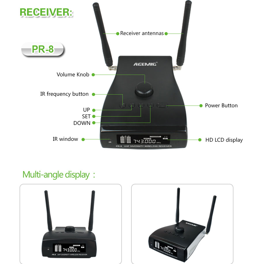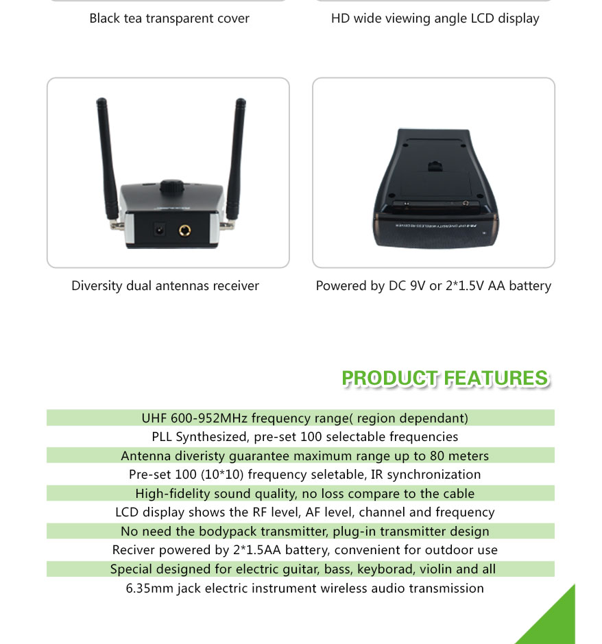 (606-630 MHz Optional), (USA: 902-928, UK: 863-865, ROK: 925-937 MHz)Receive Sensitivity: -110dBm (sinad ≥30dB)Signal/Noise Ratio: >105dBPower Supply: DC12V/ 500mAAudio Output: 1*XLR socket, 1*6.35mm jack socketTransmitter